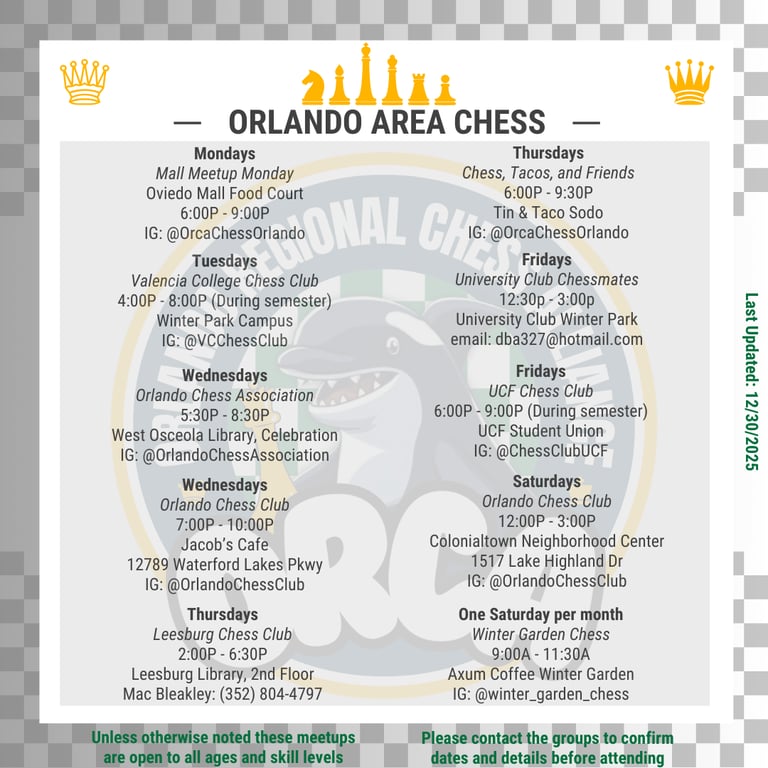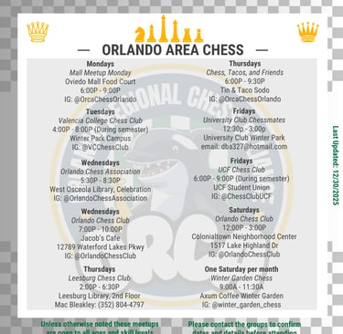 Connect with us to be part of Seminole County Chess in 2024! Join us for exciting chess events and activities including USCF rated tournaments as well as casual meetups.